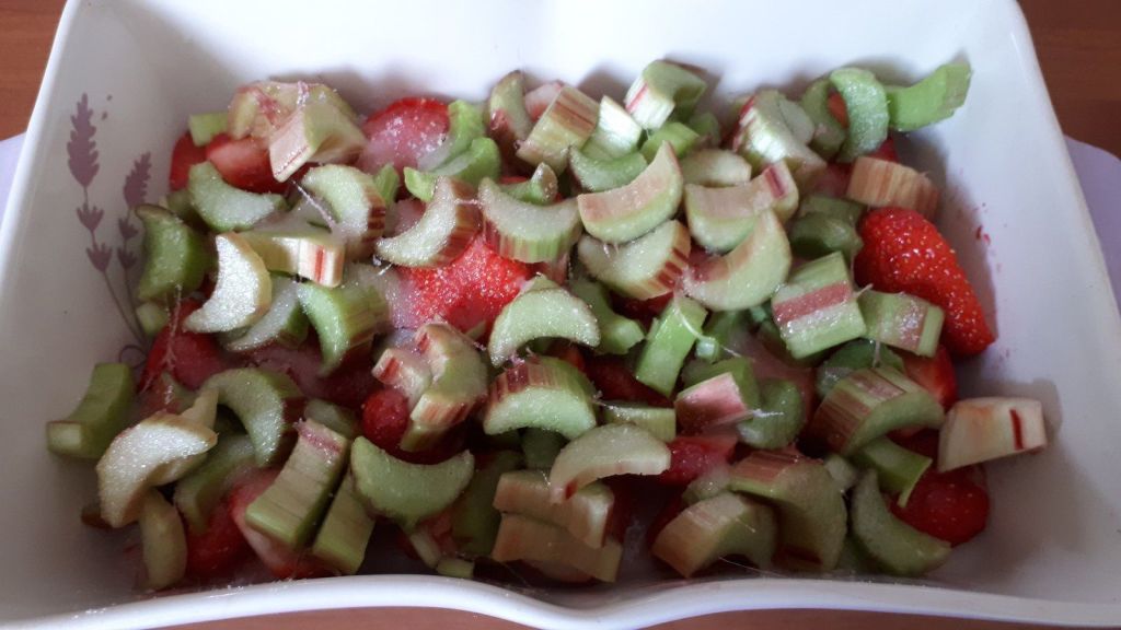 - Éplucher la rhubarbe et la couper en fins tronçons, la placer dans un plat à gratin; laver, équeuter les fraises, les couper en morceaux et les ajouter dans le plat.