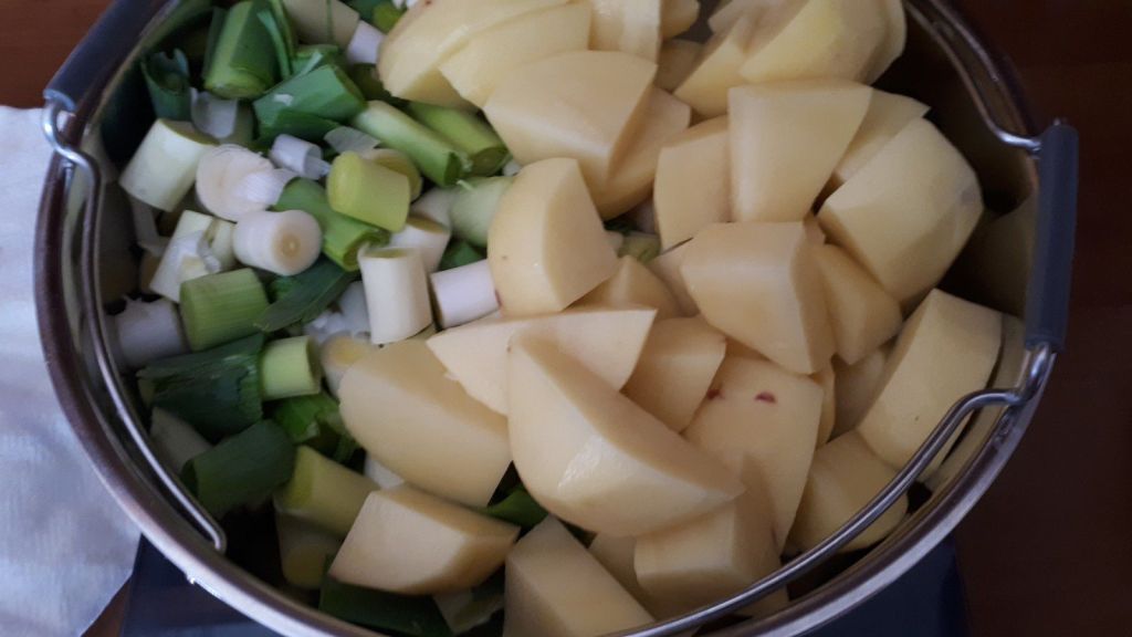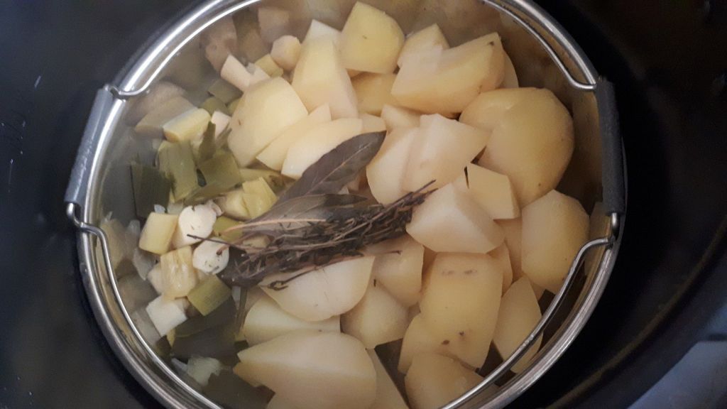 - Éplucher, laver et couper vos poireaux en rondelles, éplucher, laver et couper vos pommes de terre en cubes, les déposer dans le panier vapeur du Cookéo. Mettre l’eau dans la cuve, insérer le panier vapeur avec les légumes, déposer le bouquet garni sur le dessus puis lancer le mode sous pression 20 minutes. A la sonnerie, réserver et rincer la cuve.