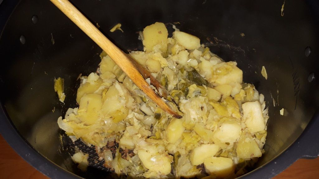 - Éplucher et ciseler un oignon, le faire une revenir avec un filet d’huile d’olive ajouter les pommes de terre et les poireaux cuits, laisser dorer quelques minutes en mélangeant régulièrement.