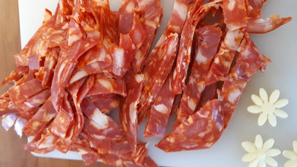 - Préparer l’appareil en fouettant les œufs et la crème, assaisonner avec le sel, le poivre et le paprika. Couper le chorizo en fines lanières.