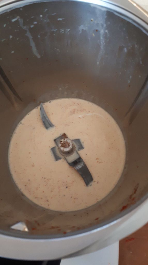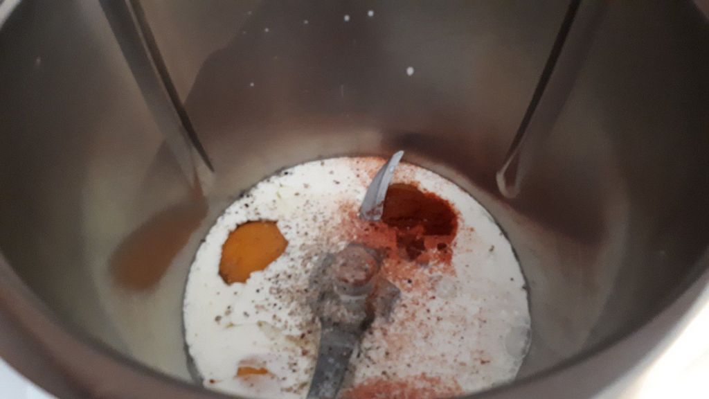 - Préparer l’appareil en déposant les œufs, la crème, le sel, le poivre et le paprika dans le bol du Thermomix puis mixer 30sec/vit4.