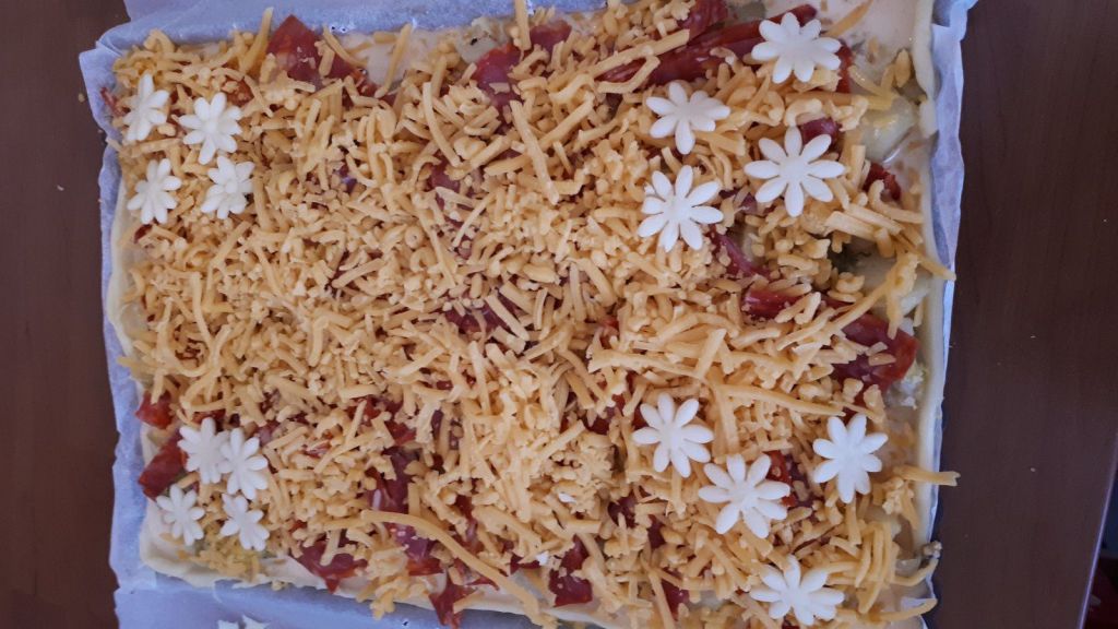 - Verser sur la pâte la préparation des légumes, puis le chorizo, verser votre appareil liquide, puis parsemer de cheddar râpé.