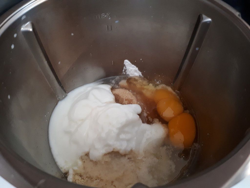 - Puis incorporer le reste des ingrédients, dans cet ordre, la farine, la maïzena, la poudre d’amandes, la fleur d’oranger, la levure, le sucre, le yaourt et les œufs puis mélanger 30sec/vit4.