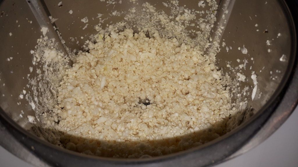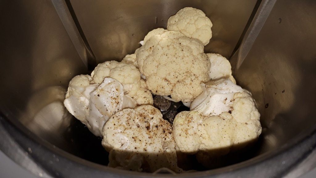 - Rincer le chou-fleur, puis le détailler en fleurettes, le mettre dans le bol du Thermomix avec du sel et du poivre puis mixer 5sec/vit5. Si vous n’avez pas de Thermomix, utiliser votre mixeur.