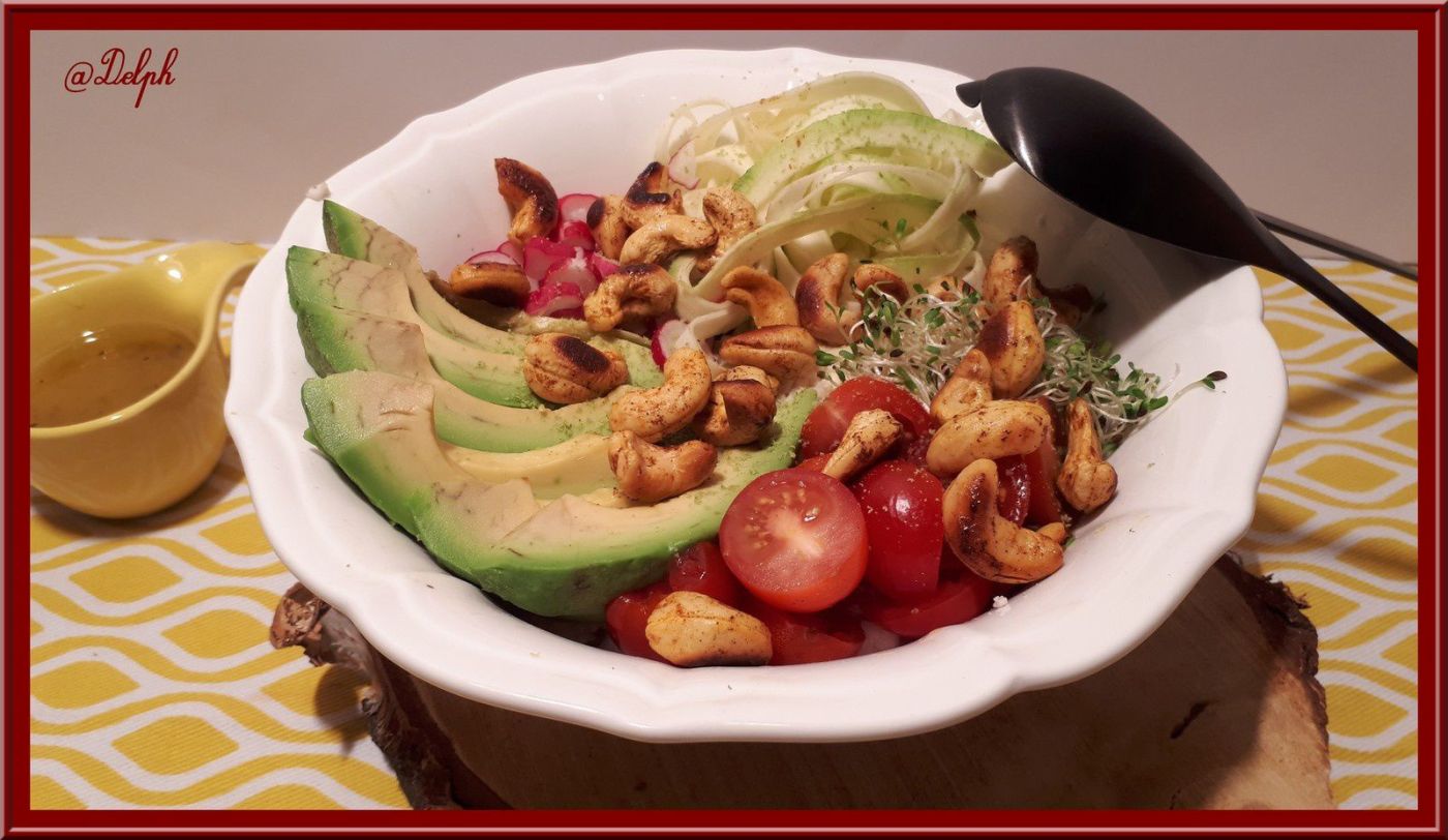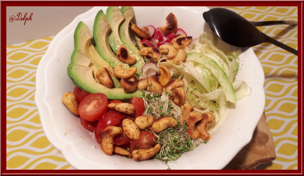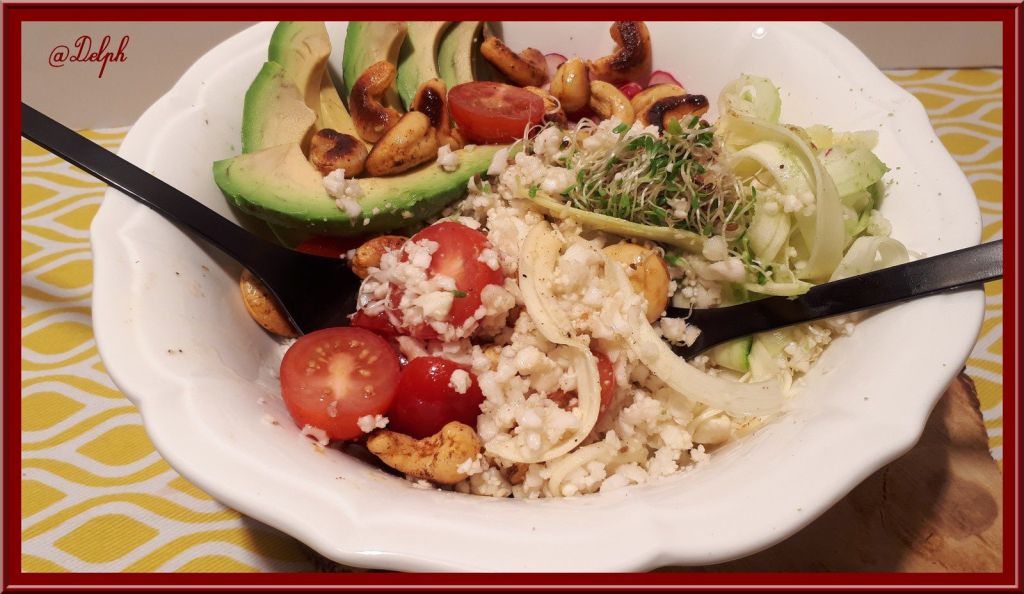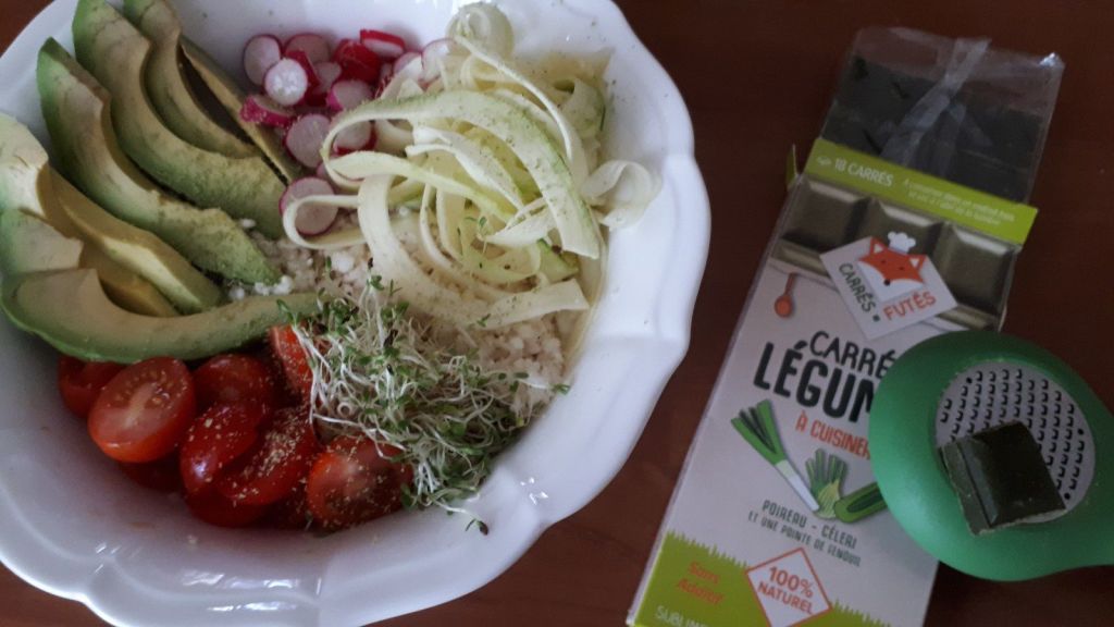 - Disposer les différents éléments de la salade dans un plat de service, arroser de sauce, râper un peu de carré légumes sur le dessus et servir.