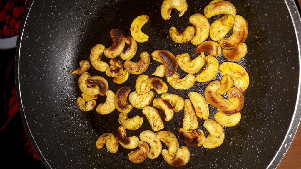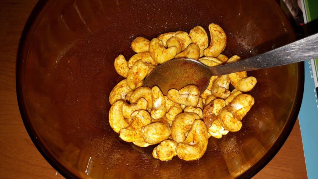 - Mettre les noix de cajou dans un bol, ajouter la cuillère d’huile d’olive, le cumin et le paprika puis mélanger. Laisser griller environ 5 minutes dans une poêle.