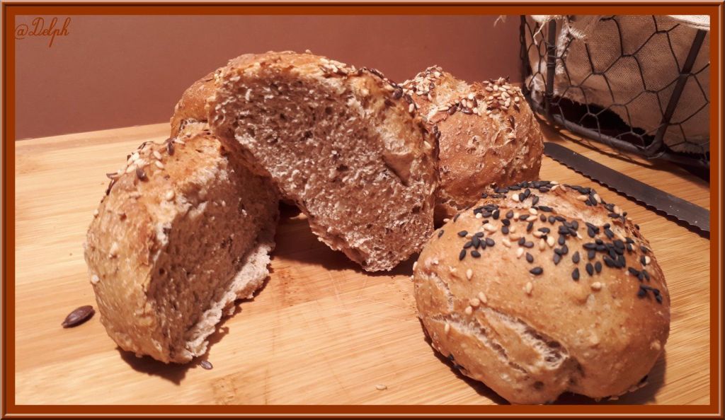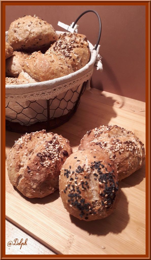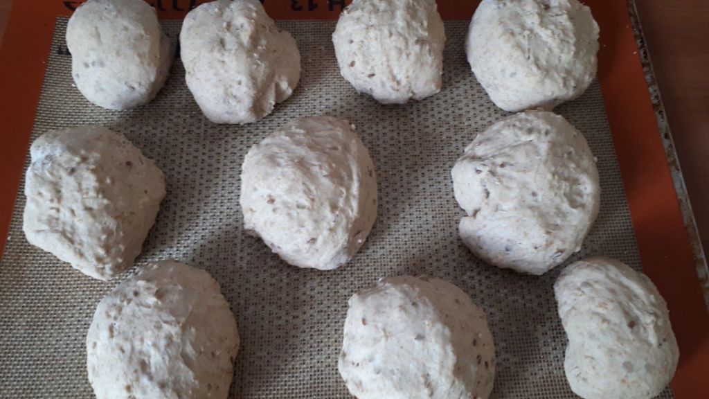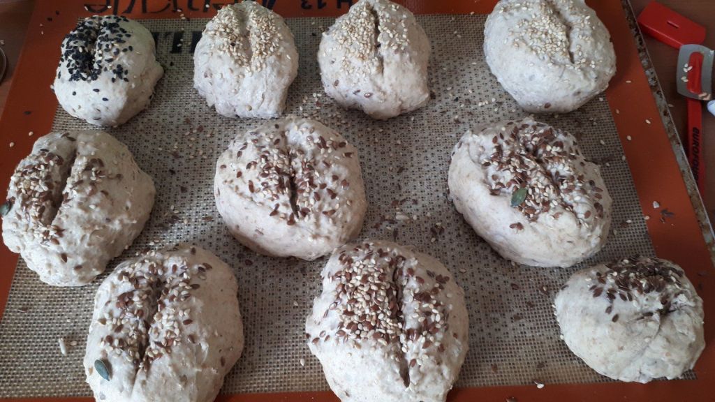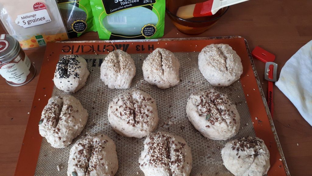 - Avec un pinceau badigeonner la surface des pains avec de l’eau et saupoudrer généreusement de graines.