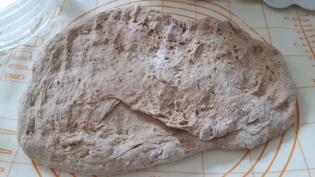 - Une fois la pâte levée, la mettre sur un plan de travail bien fariné, l’aplatir avec la main pour l’étaler sur une épaisseur de 1 cm environ. Puis la plier en 4 comme une enveloppe. Cela va donner du corps à la pâte.