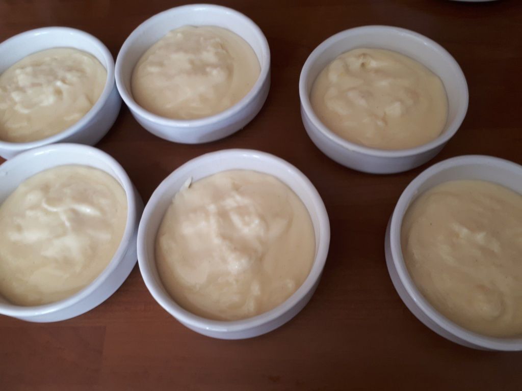 - Répartir la crème chaude dans les ramequins en terre cuite, lisser la surface.