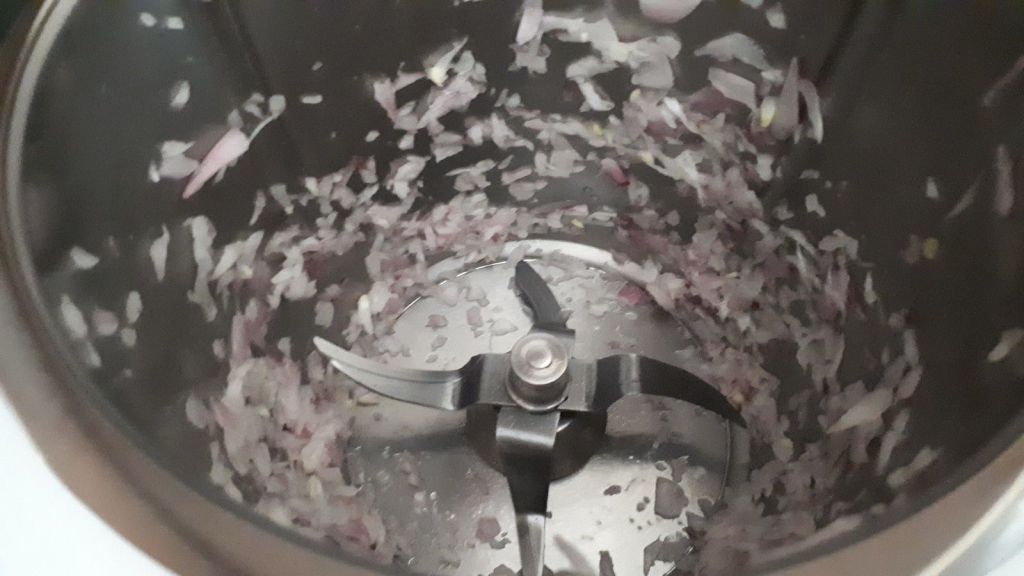 - Éplucher et couper les échalotes en deux, les placer dans le bol et mixer 5sec/vit5. racler les bords du bol avec la spatule.