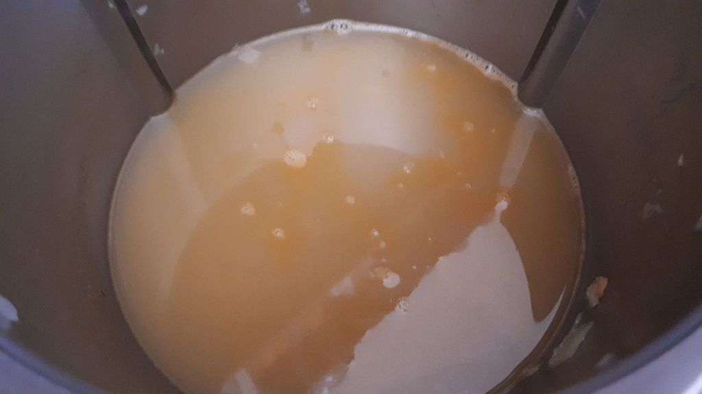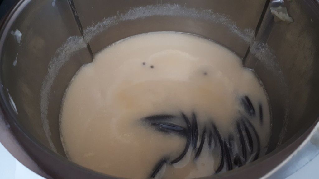 - Filtrer le jus à l’aide d’un chinois ou d’un passoire fine et le reverser dans le bol puis ajouter la crème, assaisonner, installer le couvercle sans le gobelet doseur y insérer les spaghettis à l’encre de seiche puis faire cuire 8min/Varoma/Vit mijotage.