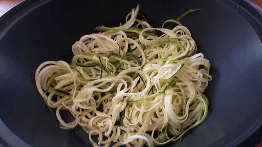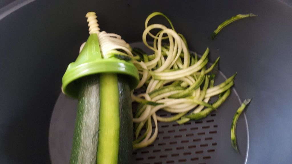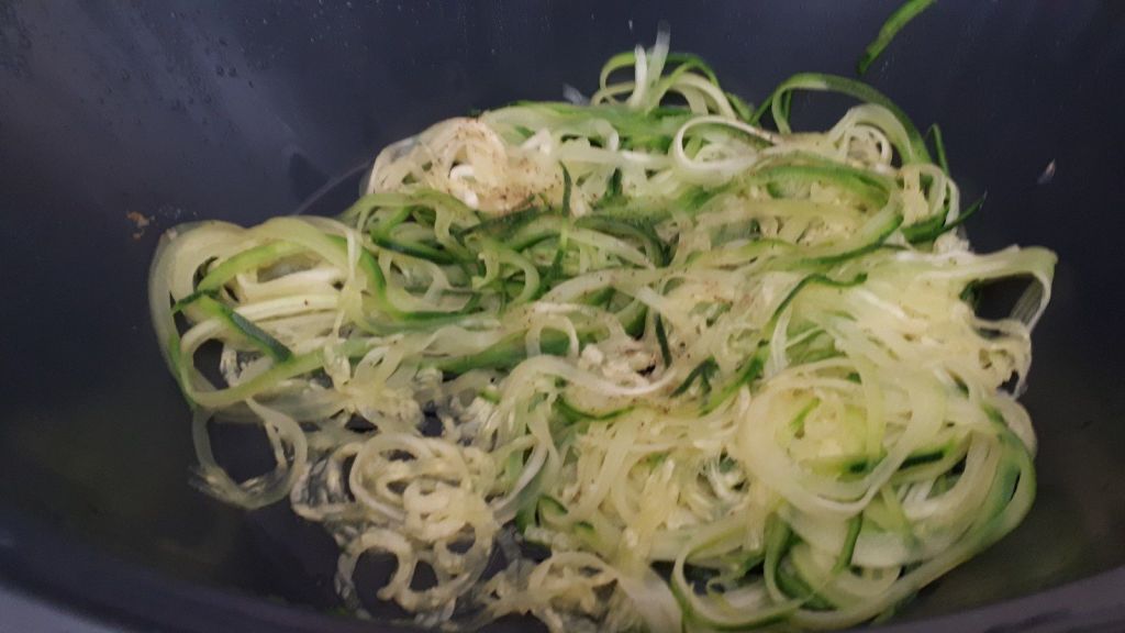 - Préparer vos spaghettis de courgette, les couper à l’aide d’un taille légumes, puis les déposer dans le Varoma, les assaisonner.