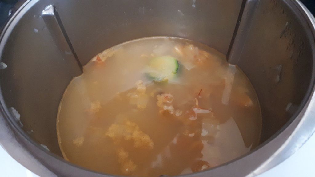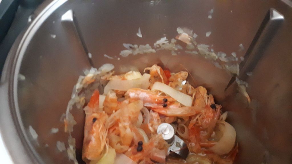 - Ajouter les têtes et les carapaces des crevettes ainsi que l’huile d’olive, puis faire rissoler 5min/varoma/vit mijotage sans le gobelet doseur. Racler le bord avec la spatule.