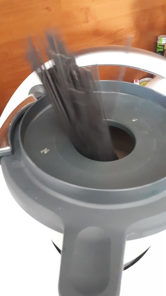- Au bout des 8 minutes, les les pâtes à l’encre de seiche doivent être entièrement dans le bol, vous pouvez installer l’ensemble Varoma et poursuivre la cuisson 7min/Varoma/vit mijotage.