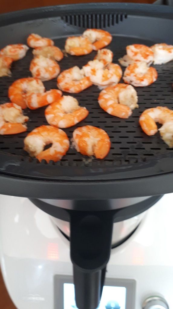 - Décortiquer les crevettes en réservant les têtes et les carapaces. Placer les crevettes sur le plateau du Varoma et réserver.