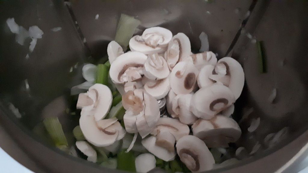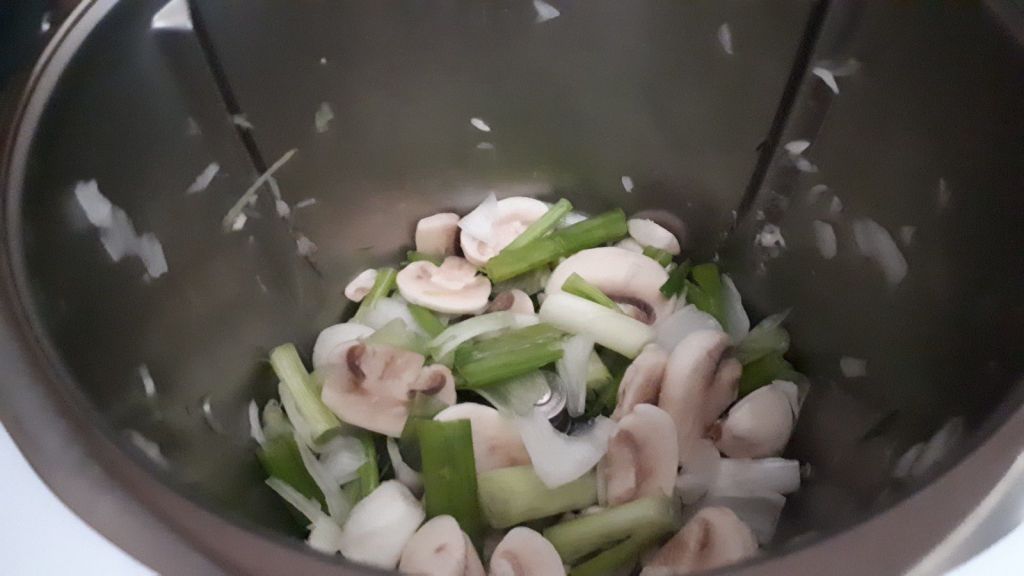- Laver les oignons, les couper en tronçons puis mixer 4sec/vit4, laver et couper les champignons en fines lamelles, les ajouter dans le bol avec l’huile d’olive et faire rissoler 3min/100°C/vit1.