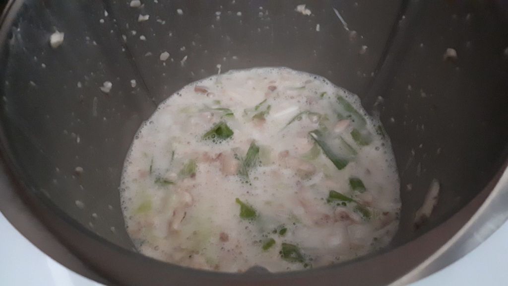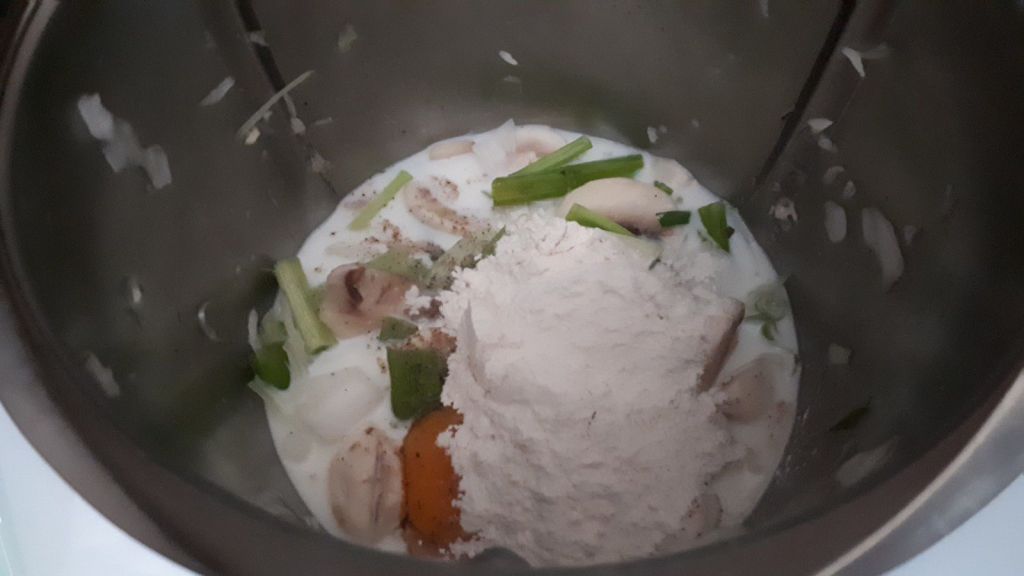 - Ajouter le lait, les œufs et la farine, assaisonner, mixer 5sec/vit4.