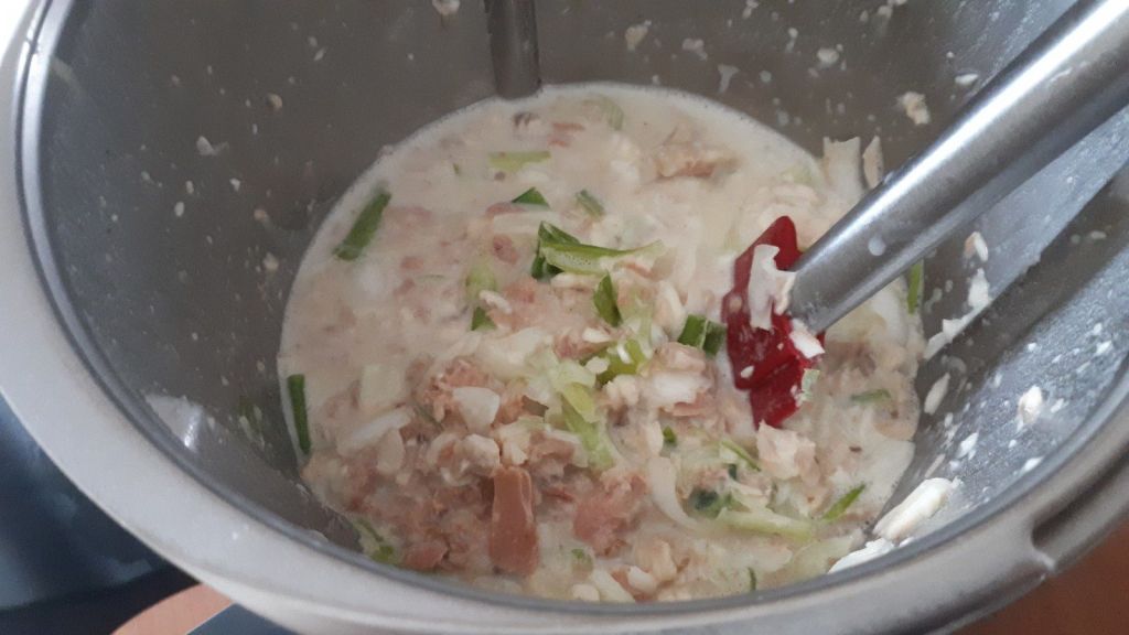 - Pendant ce temps, fouetter ensemble, le lait, les œufs et la farine, ajouter les champignons et les oignons, assaisonner, puis mélanger à nouveau. Ajouter le thon émietté puis mélanger.