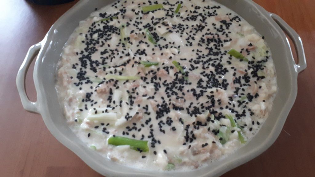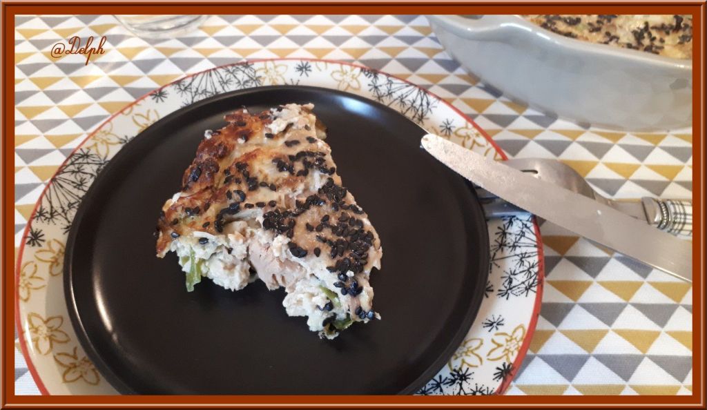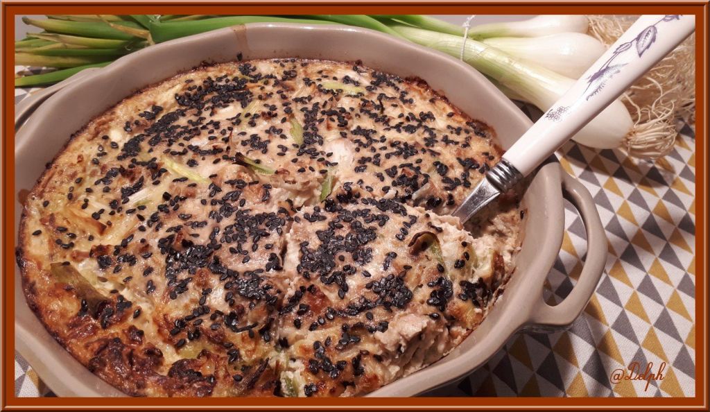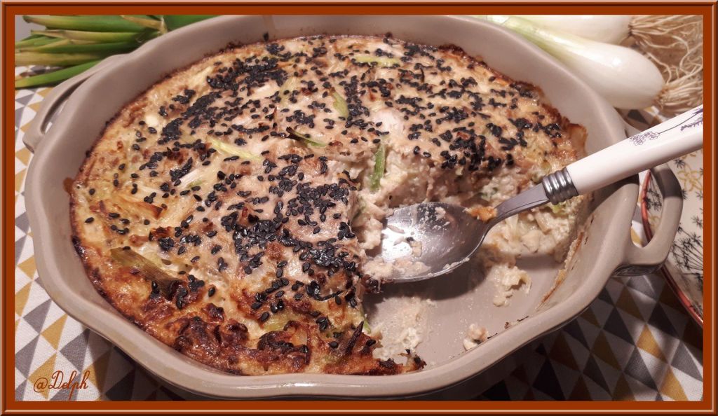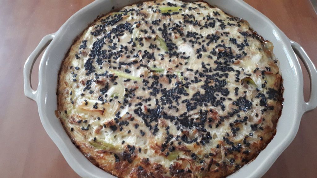 - Beurrer un plat à gratin puis y verser la préparation, parsemer de graines de sésame, enfourner pour 45 minutes et déguster tiède.