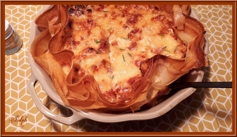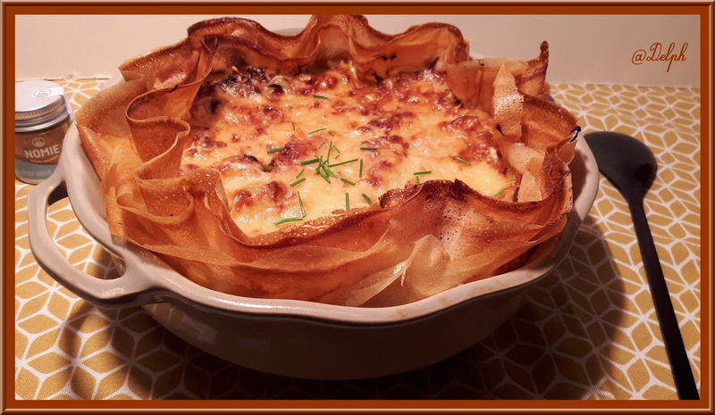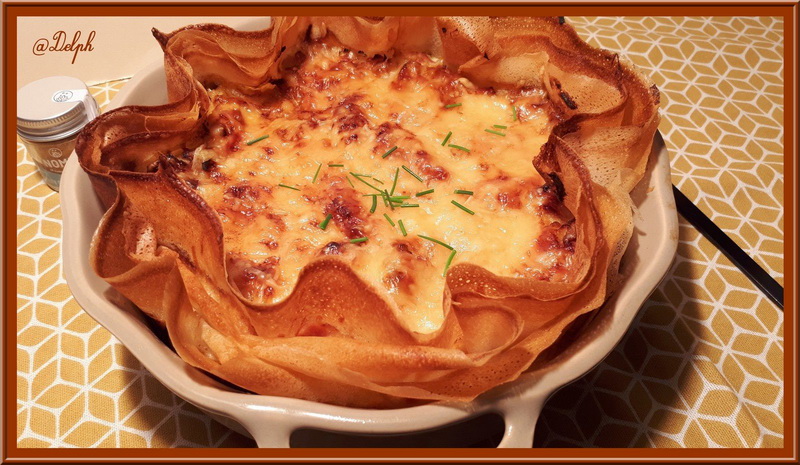 6. Badigeonner les feuilles de brick avec le beurre fondu, puis les déposer dans le fond d’un plat à gratin. Verser votre préparation, parsemer de Comté râpé et enfourner pour 35 minutes.