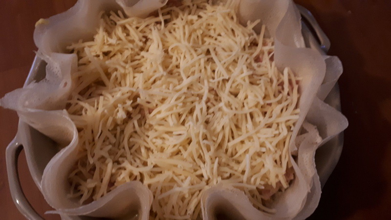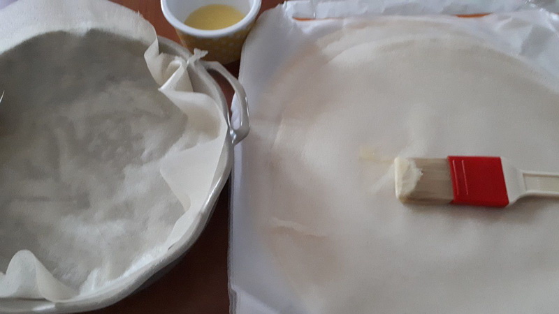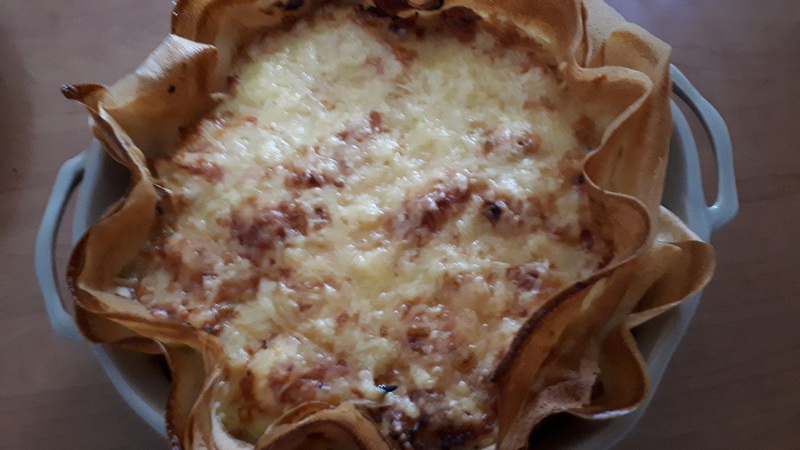 5. Badigeonner les feuilles de brick avec le beurre fondu, puis les déposer dans le fond d’un plat à gratin. Verser votre préparation, parsemer de Comté râpé et enfourner pour 35 minutes.