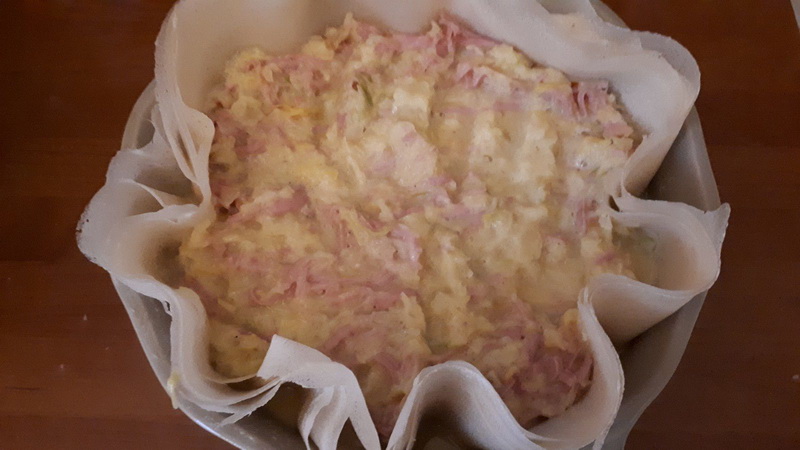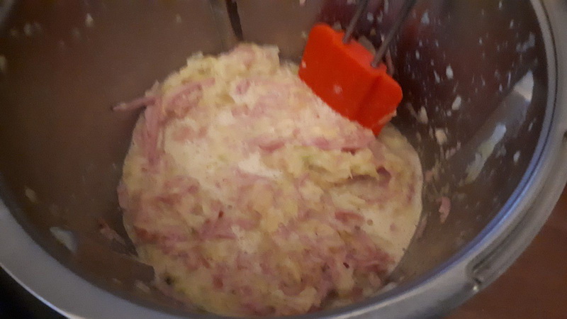5. Ajouter le lait, les œufs, le curry, le sel et le poivre puis mélanger 5sec/vit4, ajouter le jambon râpé et mélanger avec la spatule.