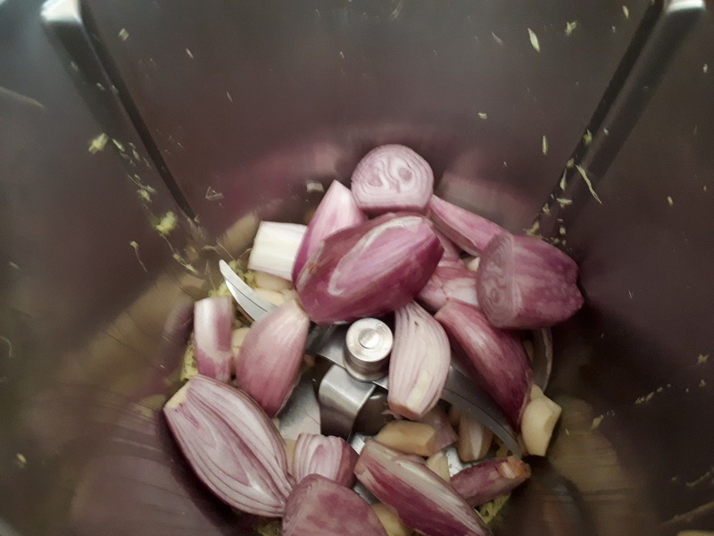 2. Ajouter l’ail, l’échalote, le sel et l’huile puis cuire 12min/120°C/couteau inversé/Vit1