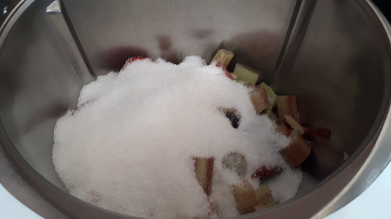 - Laver votre rhubarbe, la sécher, la couper en tronçons. Laver, équeuter vos fraises, les couper en deux, mettre le tout dans le bol du robot avec le sucre, la vanille, puis faire chauffer 12 min/100°C/vit2, enlever le gobelet doseur puis le remplacer par le panier cuisson.