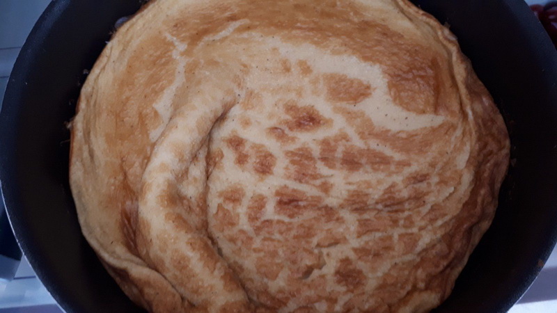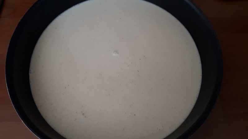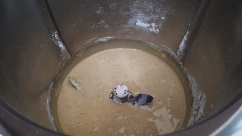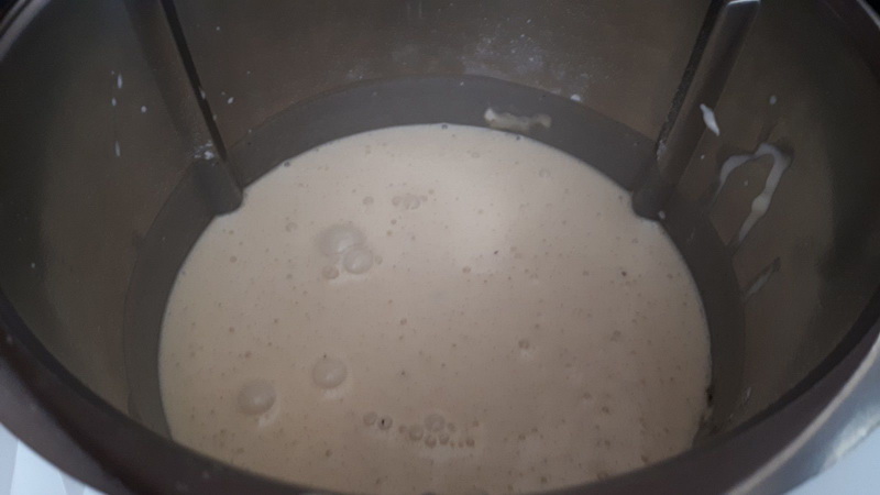 - Dans le bol, mettre les œufs, la pincée de sel, le sucre et la farine, puis mélanger 2min/vit3, ajouter le rhum, le lait et la crème, fouetter encore 2 min/vit3.