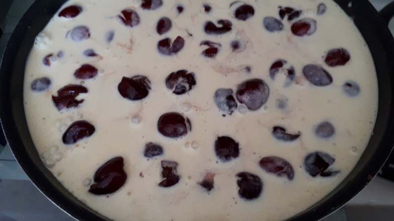 - Disposer le reste de votre pâte et les cerises sur le dessus, puis ré-enfourner pour 30 minutes, c’est à surveiller.