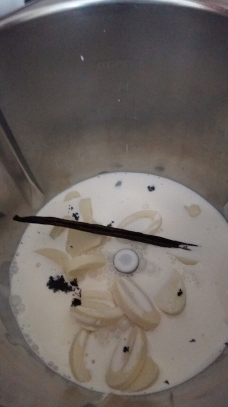 - Mettre le lait, le chocolat en pistole, les graines et la gousse de vanille grattée et la crème dans le bol et faire chauffer 4 min/100°C/couteau inversé/vit2
