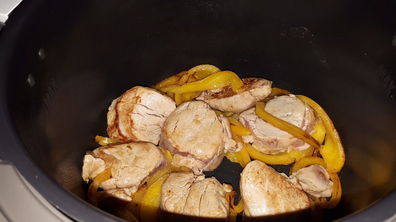 2. Dans le cookéo sur le mode dorer, faire revenir dans l’huile vos lanières de poivron pendant 6 minutes, en remuant régulièrement.