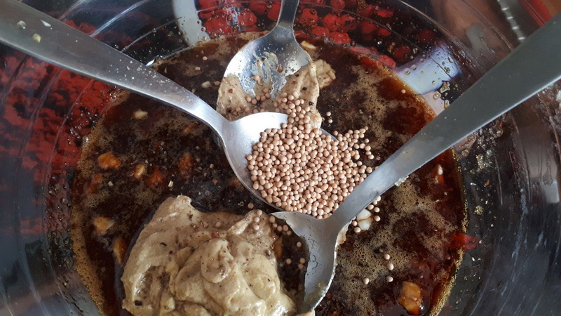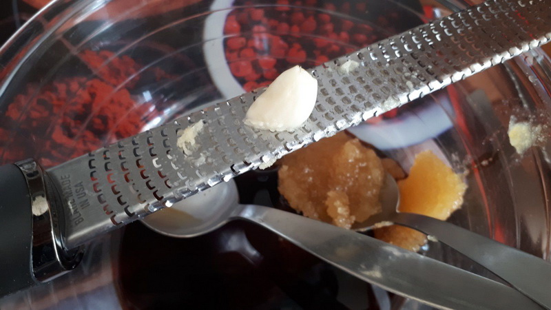 - Préparer la marinade, dans un grand saladier, mettre la sauce soja, le miel, la moutarde, les gousses d’ail épluchées dégermées et hachées (j’ai utilisé ma râpe microplane), les graines de moutarde, mélanger le tout. Assaisonner à votre goût.