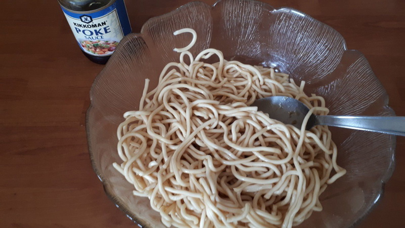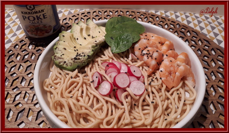 - Déposer vos pâtes dans un saladier, puis mettre de l’eau bouillante pour recouvrir les pâtes. Couvrir avec un couvercle puis laisser environ 6 minutes. Égoutter, puis mélanger avec 2 cuillères à soupe de sauce Poke.