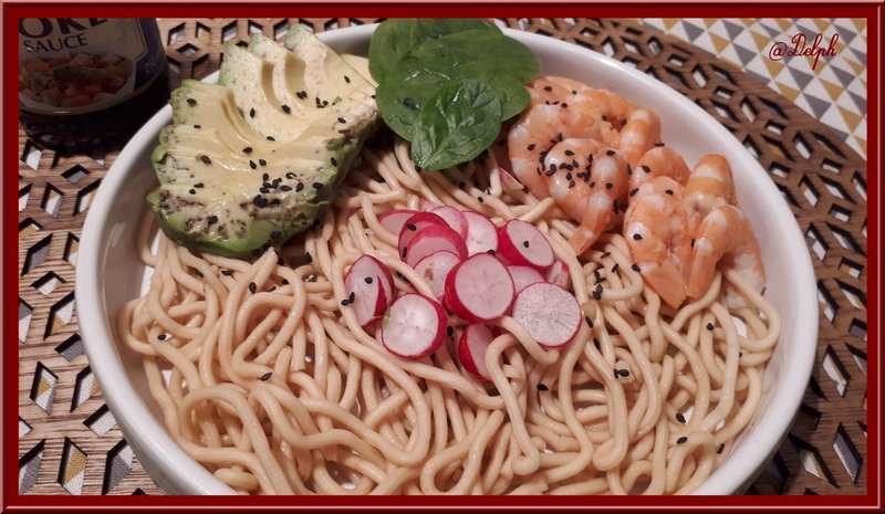 - Disposer dans votre assiette vos nouilles, vos crevettes, votre avocat, vos pousses d’épinards et vos radis, parsemer des graines de sésame.