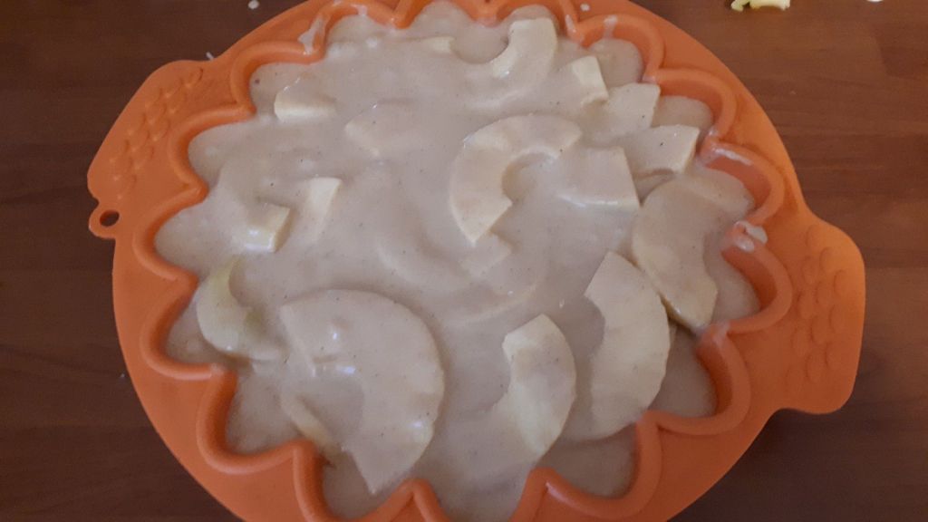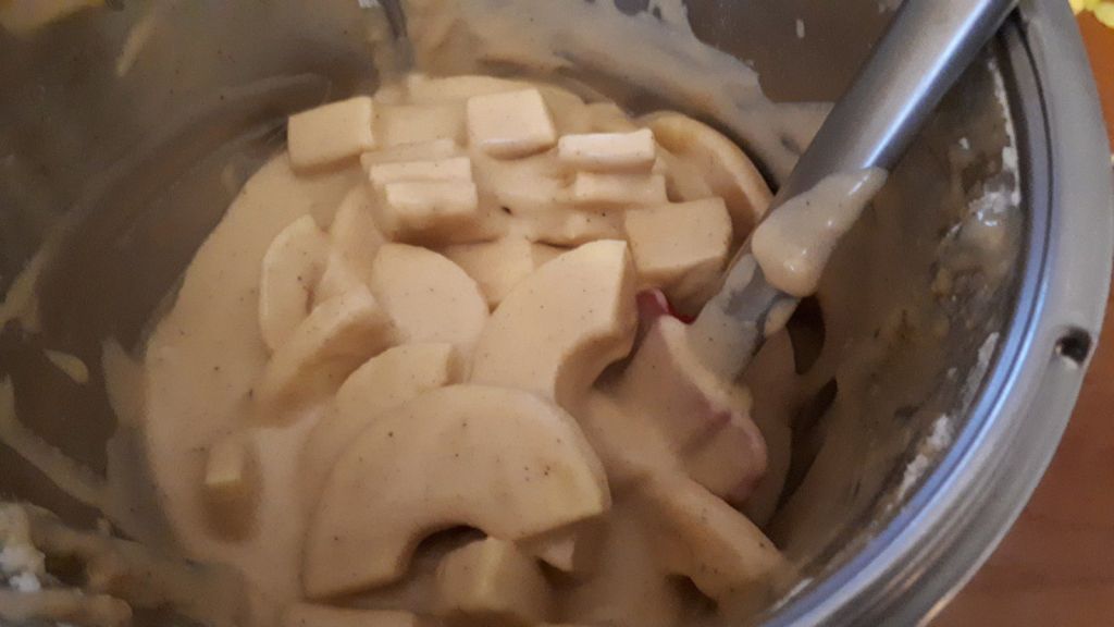 - Peler les pommes et les couper en lamelles. Les ajouter à la pâte et mélanger à l’aide d’une spatule.
