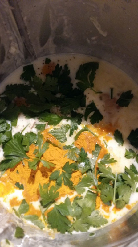 - Dans un saladier verser les œufs, la crème, le lait, battre au fouet. Ajouter le persil ciselé, le curcuma le sel et le poivre et à nouveau battre au fouet jusqu’à l’obtention d’une pâte bien lisse.