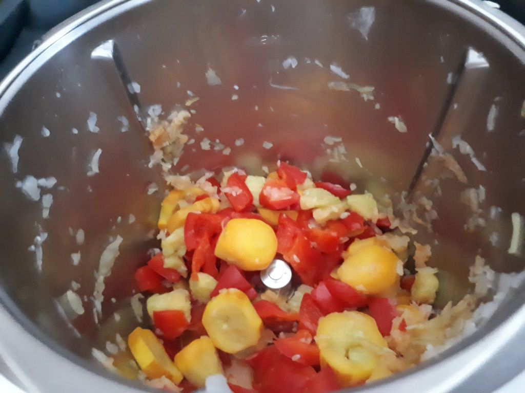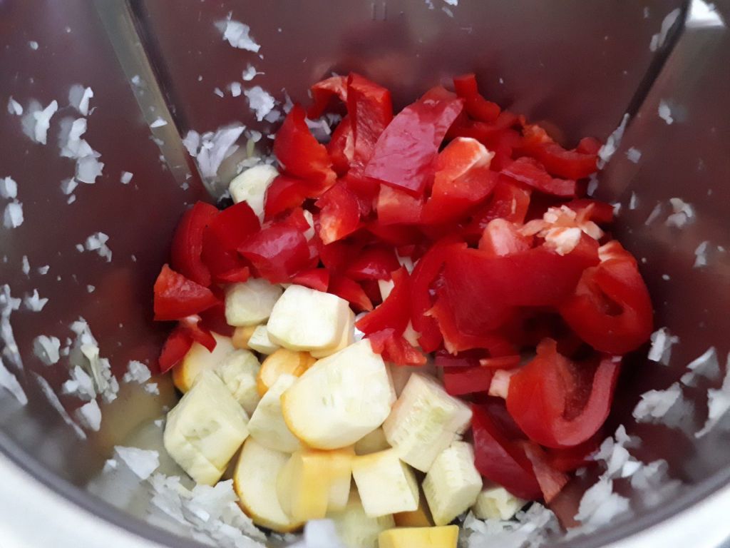 - Éplucher, laver vos courgettes et les couper en dés, les ajouter dans le bol avec l’huile d’olive, et le poivron lavé, épépiné et coupé en petits dés puis faire cuire 15min/90°C/couteau inversé/Vit mijotage, racler les bords puis continuer la cuisson5min/100°C/couteau inversé/vit mijotage.
