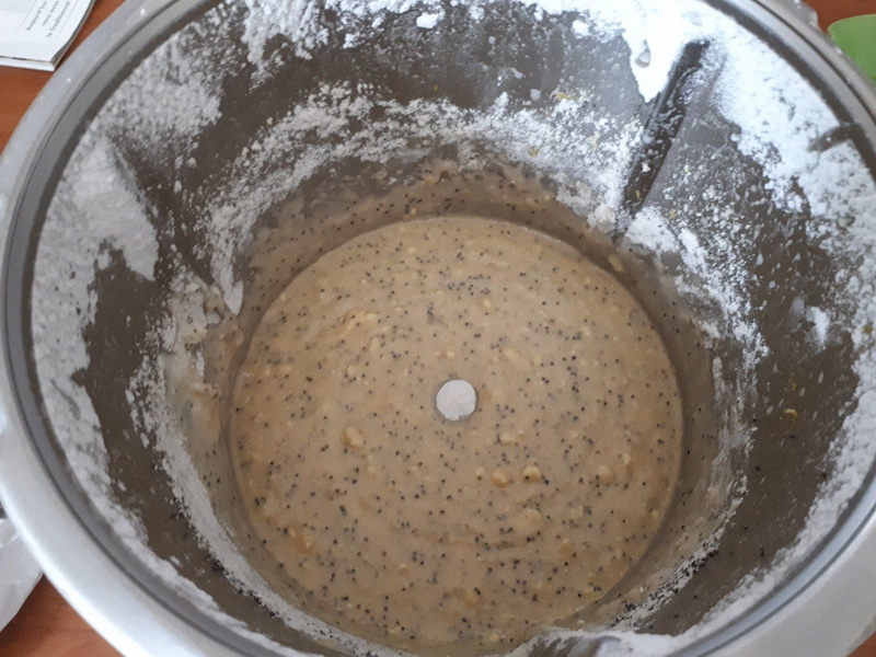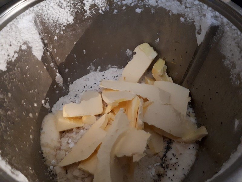 - Ajouter le beurre, le zeste et le jus de citron, les graines de pavot; la farine, la levure et la poudre d’amande puis mélanger 1min/vit 2, puis 30sec/vit3.
