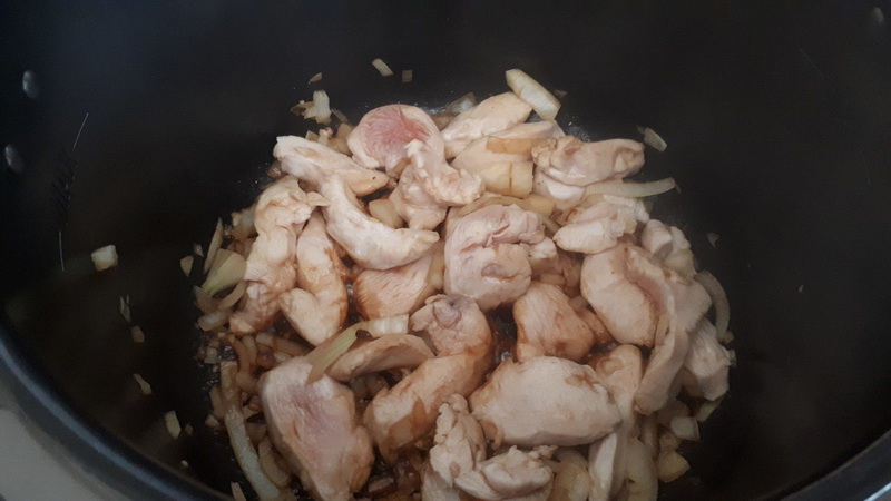 - Mettre le Cookéo en mode dorer, lorsque le préchauffage est à la moitié y déposer l’oignon, le poulet et la sauce teriyaki, mélanger à l’aide d’une cuillère en bois, puis laisser dorer 2 minutes.