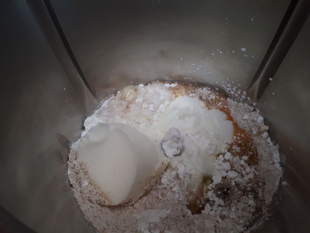 - Mettre la farine, la fécule de maïs, la levure chimique, les œufs, le yaourt, le lait et l’huile d’olive dans le bol, puis mélanger 15 sec/vitesse 4 . Racler les parois du bol à l’aide de la spatule.