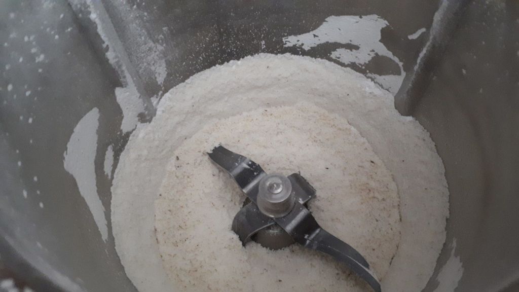 - Ajouter la farine et la poudre d’amande, mélanger 20sec/vit3.