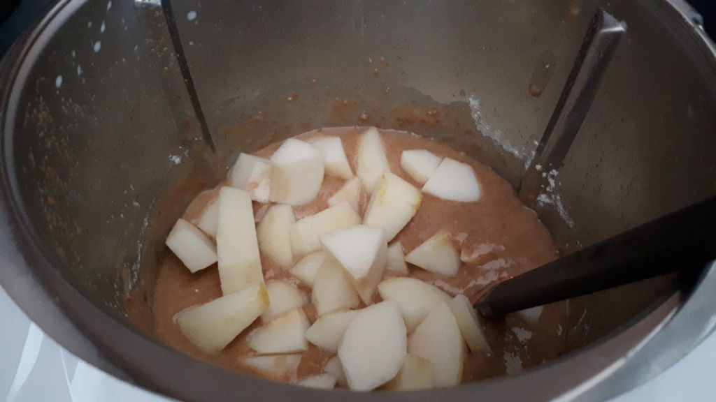 - Éplucher les poires et les couper en morceaux. Les ajouter à la préparation.