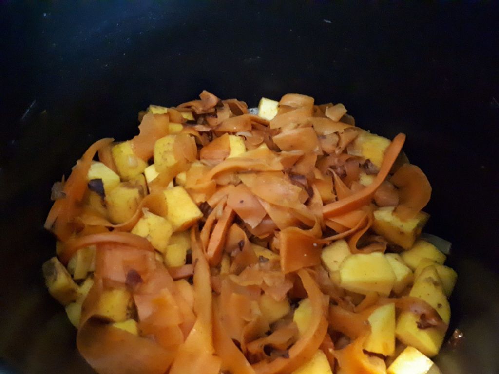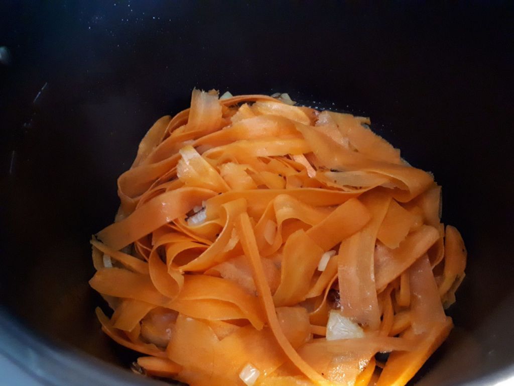 - Laver et couper les carottes en tagliatelles à l’aide d’un économe les ajouter à l’oignon, remuer et laisser revenir quelques minutes.
