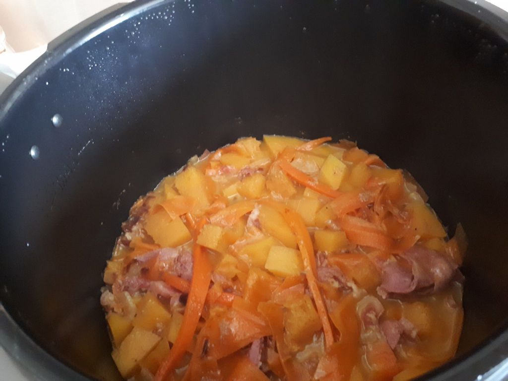 - Ajouter la butternut épluchée et coupée en petits carrés, la pancetta coupée en lanières, le cumin, le sel et le poivre puis laisser revenir environ 5 minutes.