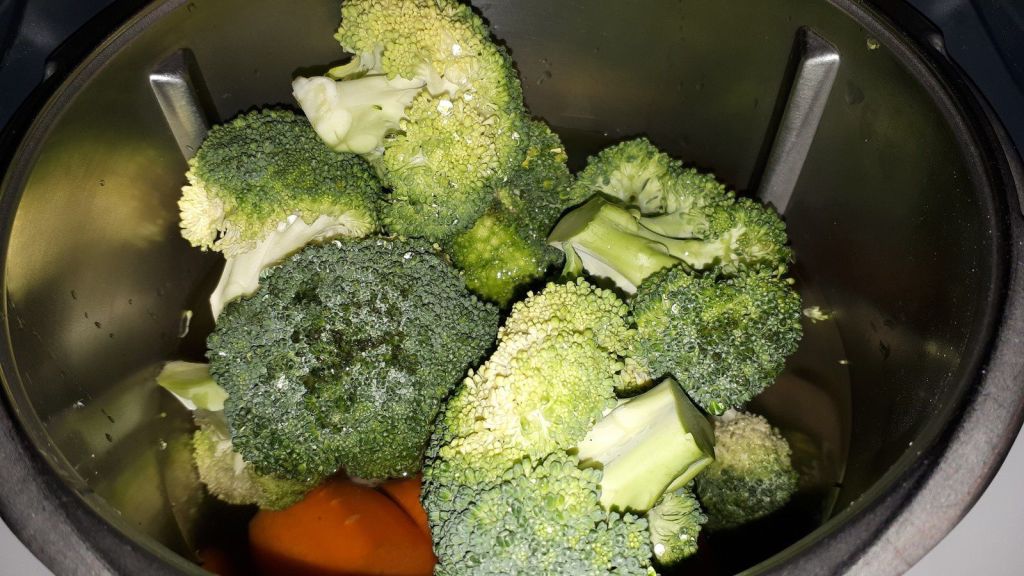 1. Éplucher votre oignon le couper en 4, éplucher, laver et couper vos carottes en grosses rondelles, détacher les bouquets du brocoli de sa tige puis les laver.