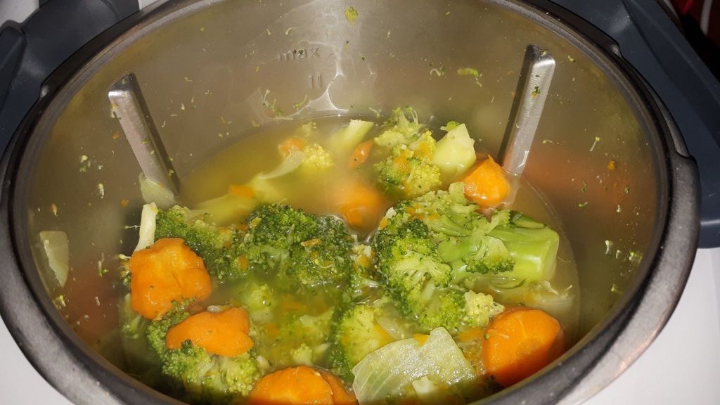 2. Déposer tous les légumes dans le bol, assaisonner, mettre l’eau et le bouillon puis programmer 20min/varoma/Vit mijotage.