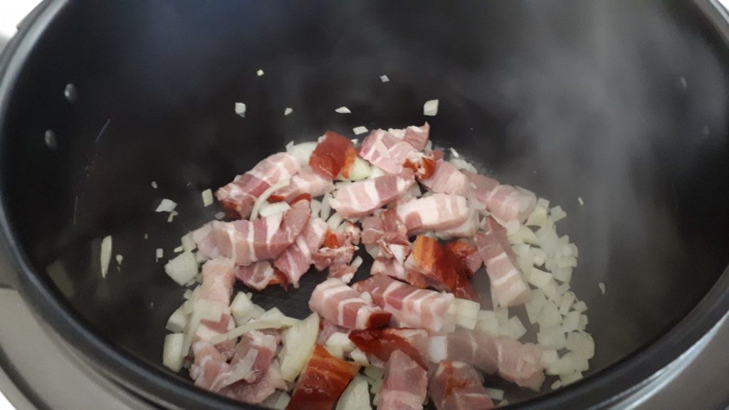 - Mettre votre Cookéo en mode dorer, dès le début du préchauffage mettre votre oignon et les lardons à rissoler pendant environ 2 minutes en mélangeant.