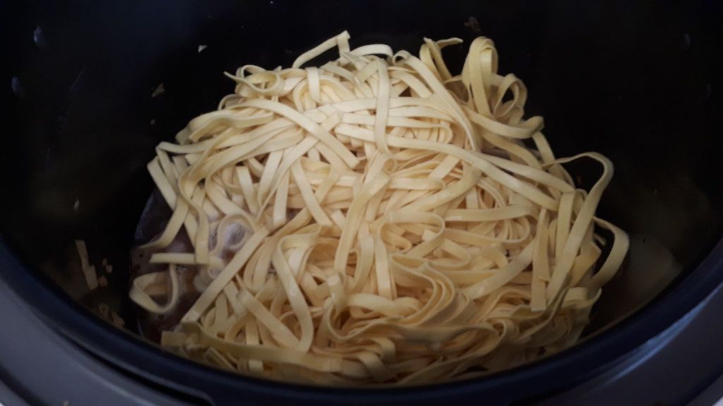 - Ajouter l’eau chaude, les tagliatelles et le poivre, mélanger et mettre en mode sous pression pour 4 minutes.