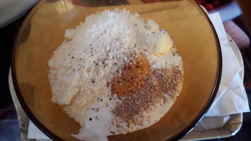 - Pendant ce temps mélanger votre crème avec votre jaune d’œuf, le sel (pas trop), le poivre, le parmesan et un peu d’ail.